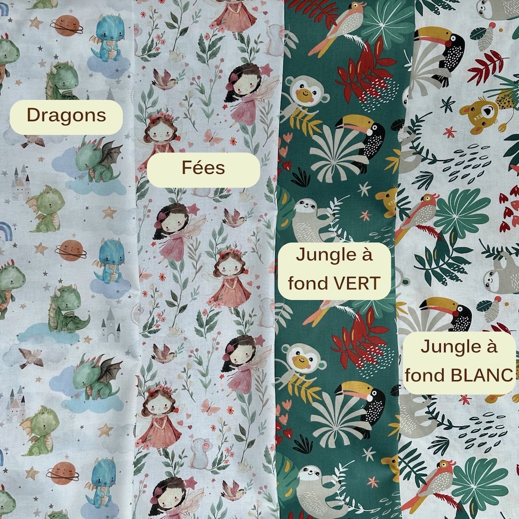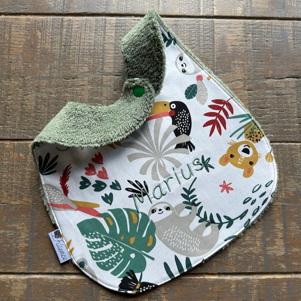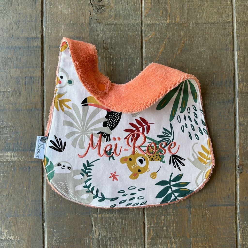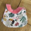 Fermeture du bavoir par bouton pression à l’arrière, au niveau de la nuque de bébé. Coloris du bouton selon tissus.