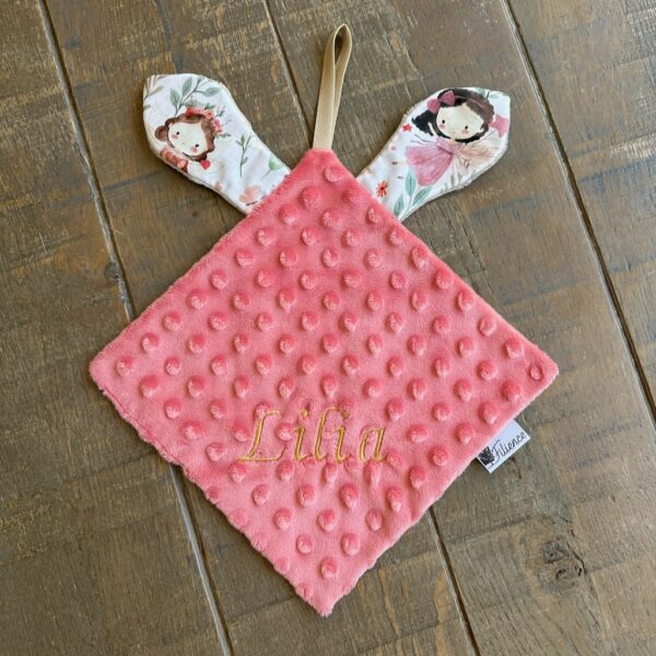 Doudou oreilles personnalisable. Tissus doux et oekotex, motifs et textures variés. Bienvenue bébé !